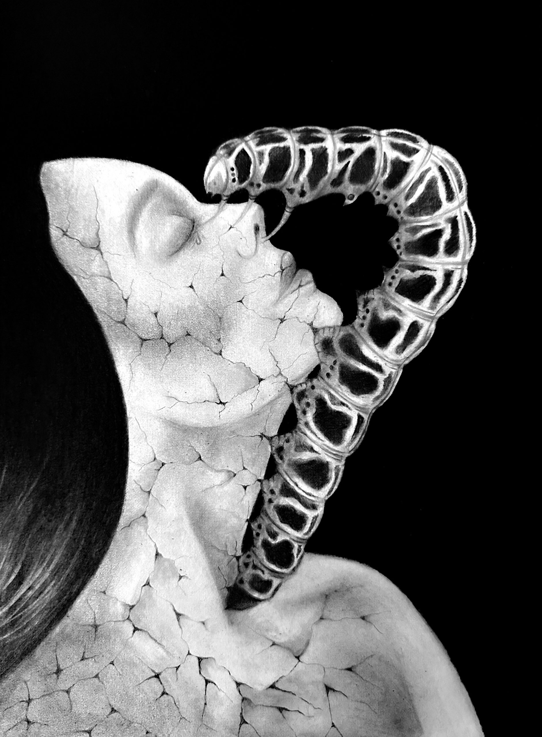 A caterpillar — timeless symbol of transformation — glides slowly across her face. Its movement feels like a chill of change: first startling, then awakening. Its path is slow, unhurried, but inevitable just like any true inner growth. Its touch doesn’t stay on the surface it stirs something deeper, responding to the quiet tension inside the body.