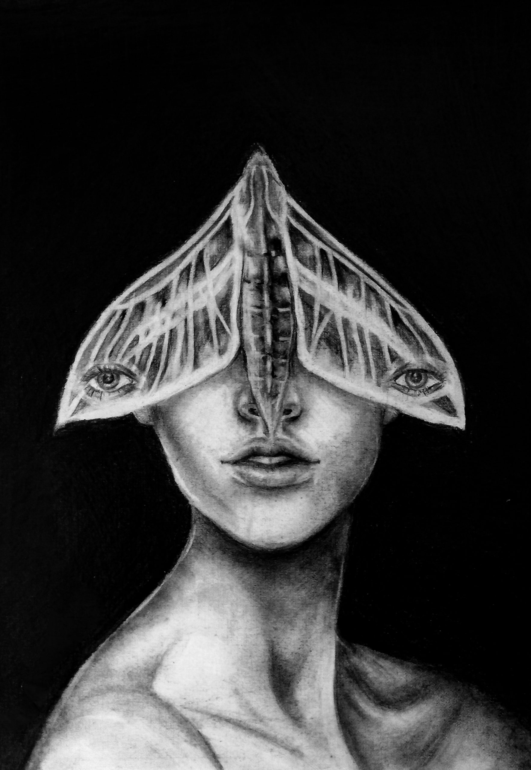 A moth rests on a woman’s face, wings spread like whispers. Weightless, almost. But that weightlessness is misleading — it carries a strange density, like a fine silk veil settling on the skin after rain.